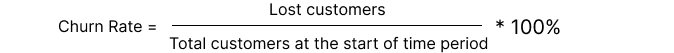 To calculate the average customer churn rate, you’d need to divide the number of customers lost during a set period by the number of customers at the beginning of the period, multiplied by 100 to get a percentage right: