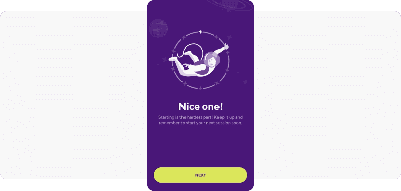Moreover, the app encourages its new learners to spend some extra time in the app on Day 1. When the first short session is over, the app makes sure to congratulate a user on their new beginning via an in-app message: