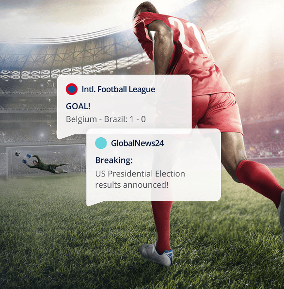 Sports organizations use High-Speed Push Notifications to inform sports fans about score changes, turning points of matches, goals and penalties, substitutions, official line-ups, red cards and other important news in real time.